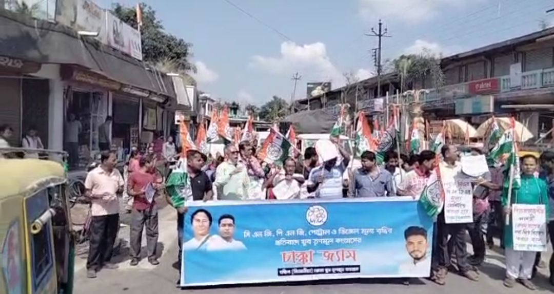 সিএনজি, পিএনজি, পেট্রোল ও ডিজেলের মূল্য বৃদ্ধির প্রতিবাদে সহ মোট পাঁচ দফা দাবিতে চাক্কা জ্যাম কর্মসুচি হয় এই দিন । এই দিনের কর্মসূচিতে যুব তৃনমুল কংগ্রেসের নেতা কর্মী, সমর্থকরা সহ তৃনমুল কংগ্রেসের শাখা সংগঠনের নেতা কর্মী, সমর্থকরা স্লোগান তুলে রাস্তা অবরোধ করে চাক্কা জ্যাম কর্মসুচি সংগঠিত করে। স্তব্দ করে দেয় যানবাহন চলাচল। ছুটে আসে পুলিশ সহ ভিসিএম। কথা বলে তৃনমুল নেতৃত্বের সাথে । রাস্তা থেকে অবরোধ তুলে নেওয়ার জন্য বলার পরেও রাজী না হওয়ায় অবরোধ কারীদের আইন মোতাবেক গ্ৰেফতার করে নিয়ে আসে অস্থায়ী জেলে । এরপর ছেড়ে দেওয়া হয় তাদের । এই দিনের কর্মসূচিতে ছিলেন, তৃনমুল কংগ্রেসের নেতা ত্রিদিব দত্ত,প্রশান্ত সেন, কাজল বনিক, যুব নেতা রাহুল চৌধুরী সহ অন্যান্য নেতৃত্বরা।