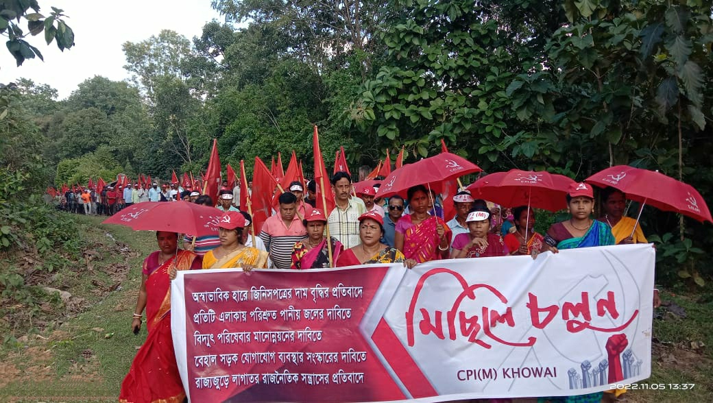 শনিবার দুপুরে সাহসী মানুষের প্রতিরোধের চেহারা দেখলো মধ্য গণকী গ্রামের মানুষেরা।প্রতিরোধী মানুষের লাল বাহিনীর সুতীব্র গর্জনেও প্রতিরোধের মুখে পিছু হটলো সন্ত্রাসী বাহিনীর কাপুরুষ দুষ্কৃতীরা।আসন্ন ২০২৩ এর নির্বাচনে ঝাঁপিয়ে পড়ে বীরদর্পে ভয়ভীতি আর সন্ত্রাসের বাতাবরণ চূর্ণ করে গণতন্ত্রের ধর্ষকদের প্রতিরোধের বার্তা ছড়ালো লাল তেরঙ্গার সম্মিলিত বজ্রনির্ঘোষ কন্ঠের আওয়াজ তোলা শ্লোগান সোচ্চার গর্জমান মিছিল থেকে।আর সেই মিছিলে সামিল জনস্রোতের মেজাজ দেখে বীরদর্পে পশ্চাদপ সরণের মতো মানে মানে কেটে পড়ে মিছিল আটকানোর জন্য আসা সন্ত্রাসীরা।দুই ঘন্টায় সাত কিলোমিটার উঁচু উঁচু টীলাভুমির রাস্তা পরিক্রমা করে শত শত লাল সৈনিকের দৃপ্ত মিছিল সংগঠিত করে। দ্রব্যমূল্য বৃদ্ধিরোধ, বিদ্যুত , পানীয় জল ও সড়ক যোগাযোগ ব্যাবস্থার পরিষেবার মানোন্নয়ন ও রাজ্য জুড়ে লাগাতার সন্ত্রাস সৃষ্টি শাসকদলীয় ষড়যন্ত্র বন্ধ করার দাবীতে এদিন মিছিলের কর্মসূচী ছিল মধ্য গণকী ও পূর্ব সোনাতলা সহ রাধাচরণনগরে।সি পি আই এম এর মহকুমা কমিটির আহ্বানে খোয়াই বিধানসভা কেন্দ্রের বুথে বুথে গত দুই মাস ধরে চলছে মিছিল পদযাত্রার সাহসী কর্মসূচী।বাহান্নটি বুথের সবকটিতেই চলছে এই অবিরাম পথচলা। শনিবার প্রথমে শহর থেকে দেড়শত মোটর বাইকের সাড়া জাগানো রেলী ছুটে চলে রাধাচরণনগর অভিমুখে।আগে থেকেই সেখানে জড়ো ছিলেন পায়ে হাঁটা মিছিলের অগ্রণী পদাতিক বাহিনীর সেনানীরা।বেলা সাড়ে বারোটায় রাধাচরণনগর থেকে বের হয় লাল সাজে সাজোয়া বাহিনীর গর্জমান মিছিল হাতে লাল ঝান্ডা। মাথায় লাল টুপি আর লাল ছাতা